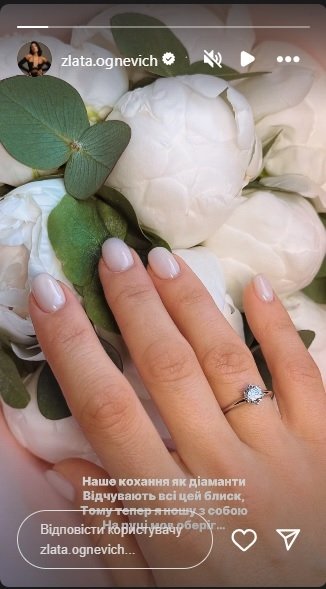 В своих instagram-сторис Злата Огневич опубликовала фото, на котором запечатлена ее рука с кольцом на безымянном пальце. Руку с красивым нежным маникюром артистка сфотографировала на фоне красивого светлого букета.