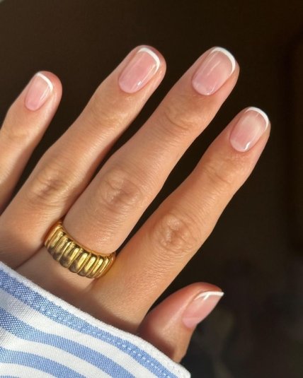 В стиле old money очень популярен именно французский маникюр с очень тоненькими полосочками. Конечно, без кислотных цветов. Также этот тренд перекликается с техникой "втирки", когда ногти выглядят перламутровыми.