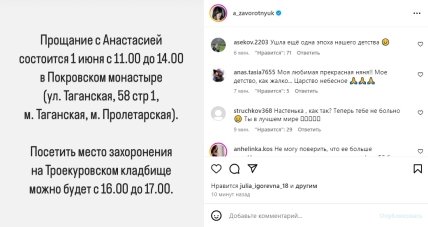 Так, згідно з інформацією, опублікованою на офіційній сторінці Анастасії Заворотнюк, прощання з нею проходитиме 1 червня з 11.00 до 14.00 у Покровському монастирі. Відвідати місце поховання на Троєкурівському цвинтарі можна буде з 16:00 до 17:00.