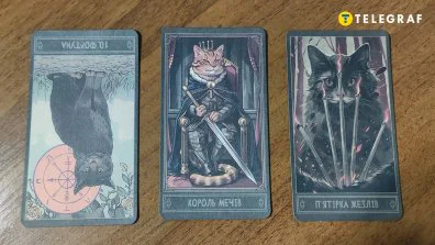 Зліва направо — перевернуте Колесо Фортуни, Король мечів, П’ятірка жезлів /telegraf.com.ua