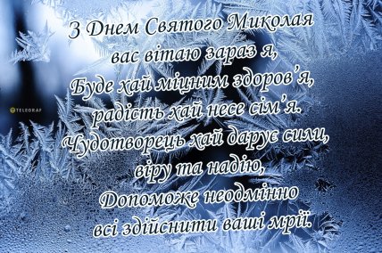 Вітаю вас зі світлим християнським святом — Днем святого Миколая! Бажаю, щоб цього дня у вашій оселі запанували мир, чистота, гармонія і затишок! Нехай усі образи та прикрощі залишаться далеко позаду, а попереду чекатимуть нові перемоги та благі звершення!